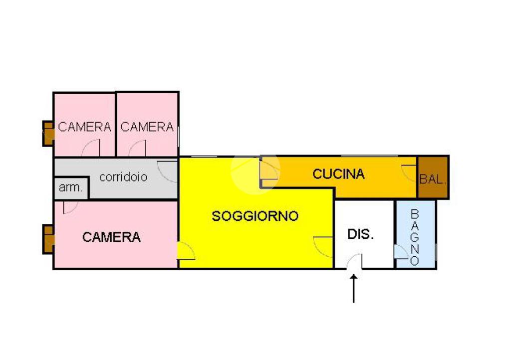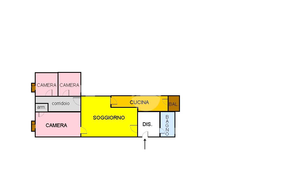 Appena varcata la porta d'ingresso, un comodo disimpegno introduce alla zona giorno, sulla destra troviamo il bagno, mentre sulla sinistra si apre un ampio e accogliente soggiorno, perfetto per momenti di relax o convivialità. Dal soggiorno si accede alla cucina, con uscita su un comodo balcone, ideale per momenti di relax. Sempre dal soggiorno si raggiunge una camera da letto matrimoniale, mentre un corridoio interno conduce a due ulteriori camere, ideali come camerette o studio.